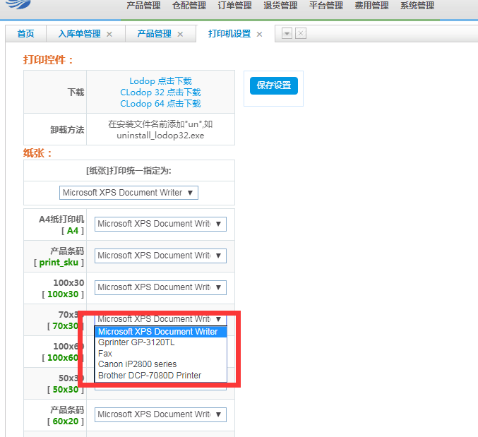 4.選擇對應的條形碼尺寸,并選擇自己對應的打印機。