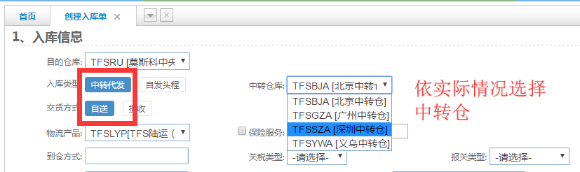 2.入庫單制作界面填寫下列信息(因攬收選項地址未維護,派送方式選【自送】,不影響上門取貨)