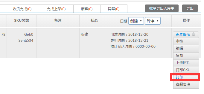 6.在【倉配管理】中的【入庫單管理】界面搜索入庫單信息,打印入庫清單和箱單