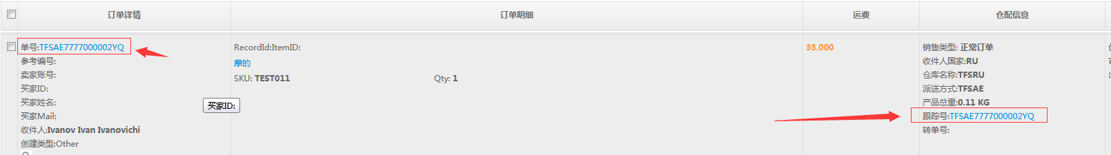 2.訂單提交成功后,如果是具備秒出單號功能的渠道,系統(tǒng)會秒生成TFS單號,即是跟蹤號,便可在平臺發(fā)貨使用了(跟蹤號如圖:)
