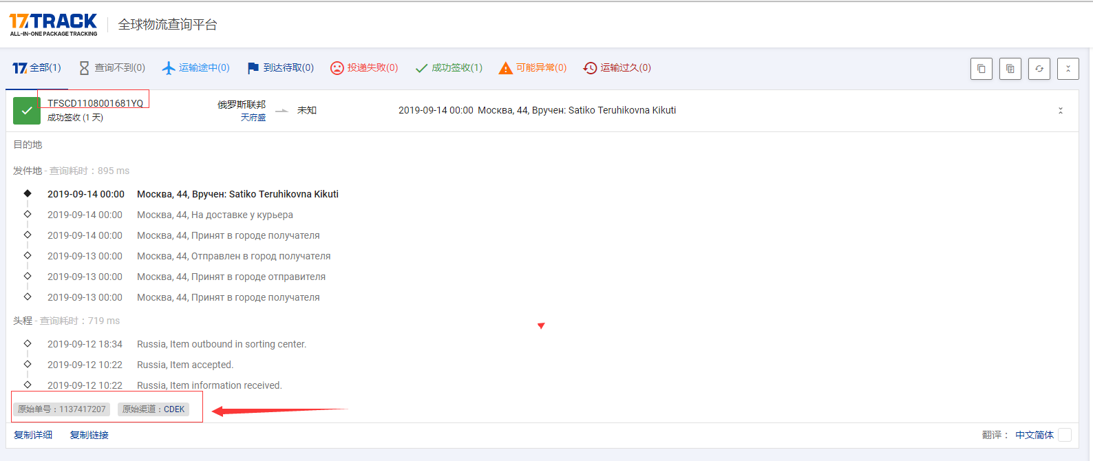 1.溫馨提示:當(dāng)買家在俄羅斯郵局自助取貨時,要通知或留言買家用查詢軌跡時得到的俄郵的原始單號(如圖所示)去取貨。其他快遞渠道則不用原始單號取貨(快遞是送貨上門)。