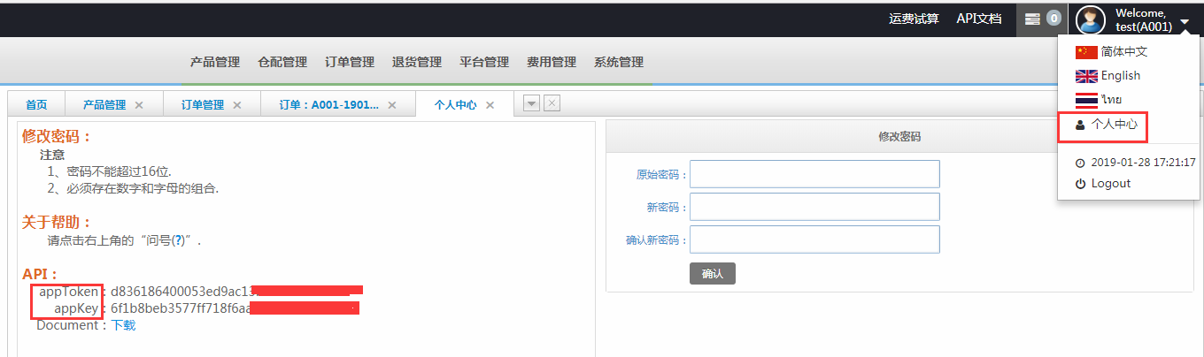 可登錄天府盛海外倉客戶端系統(tǒng)(登錄賬號及密碼可聯(lián)系天府盛銷售獲?。c擊網址 http://www.tfs906wms.com:81 如下圖位置獲取appToken和appKey